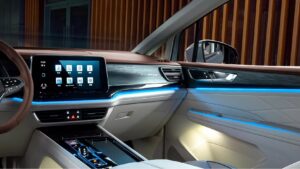Bước vào khoang lái, người dùng sẽ được chào đón bằng hệ thống đèn viền nội thất trải dài trên táp lô và thành cửa toát lên vẻ hiện đại, công nghệ. Ngay trung tâm táp lô là màn hình giải trí cảm ứng cỡ lớn đủ sức đáp ứng nhu cầu giải trí cao từ người dùng.